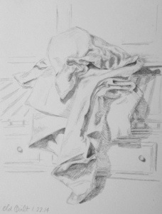 There really is something comforting about the control you get with pencil, though, so it seemed appropriate as a starting point for digging back into art. I also don’t plan to sell pencil sketches, so the medium is a bit more intimate. I have done quite a few paintings for sale recently, and while I very much enjoy sharing my art, that was not the purpose of this exercise. Just to make sure that I had eliminated any thoughts of making a drawing that might sell, I picked a quilt I made in high school as my subject. I really enjoyed getting lost in the folds of the quilt, and very much enjoyed getting back to pencil.